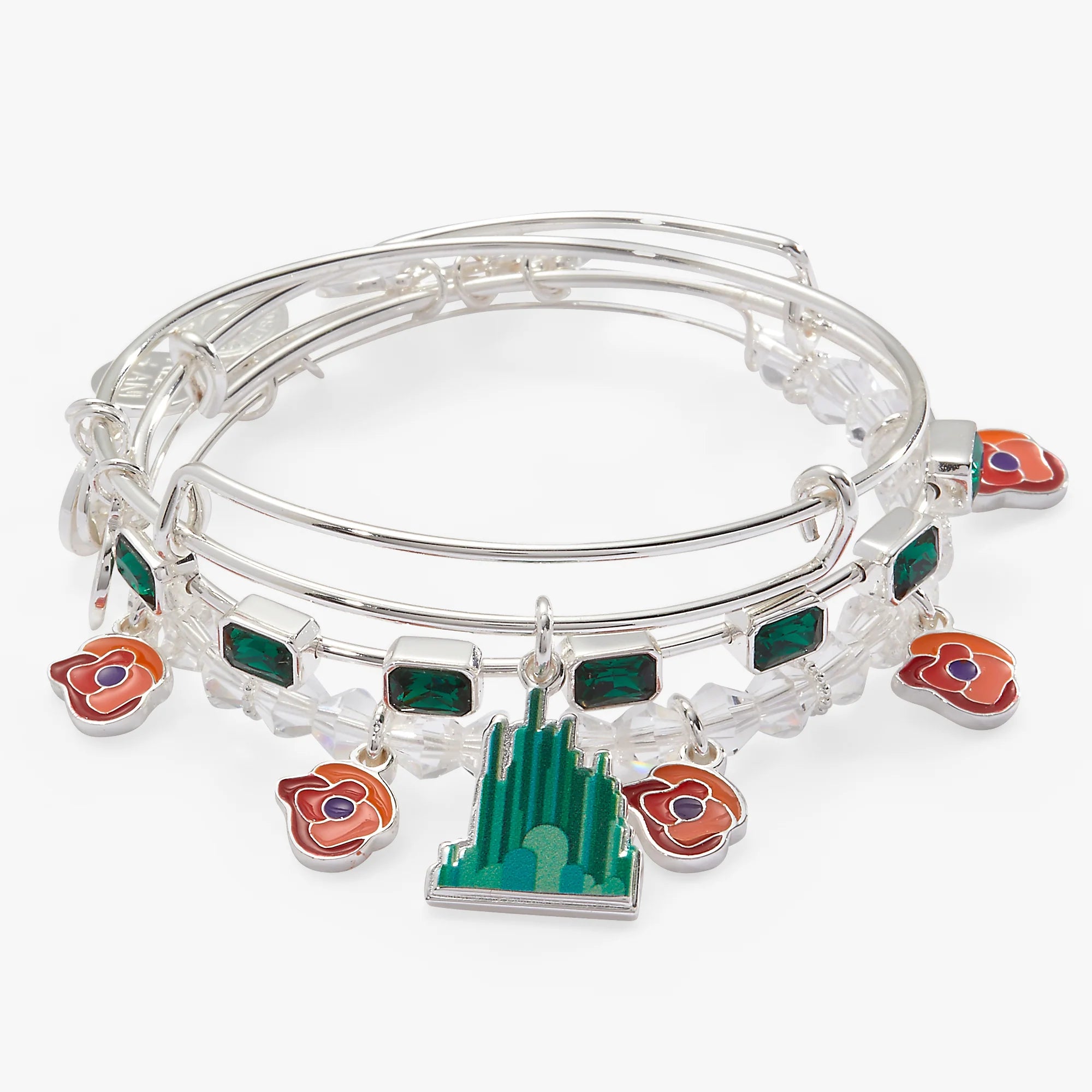 Follow the Yellow Brick Road to timeless Wizard of Oz® jewelry. This Emerald City Set of 3 Bangle Bracelets features three expandable wire bangles. One has an enamel charm of the Emerald City, one has red poppy and clear crystal beads, and one has green crystal beads that evoke emeralds. Wear it to celebrate 100 years of the classic film.