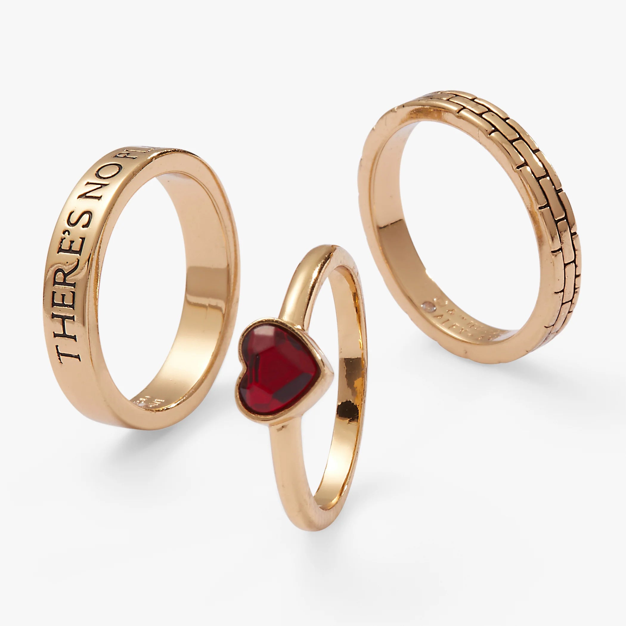 Follow the Yellow Brick Road to timeless Wizard of Oz® jewelry. This ring set features three individual rings. One is textured to look like golden bricks, one features a red crystal heart, and one has an inscription saying "There's no place like home." Wear it to celebrate 100 years of the classic film.