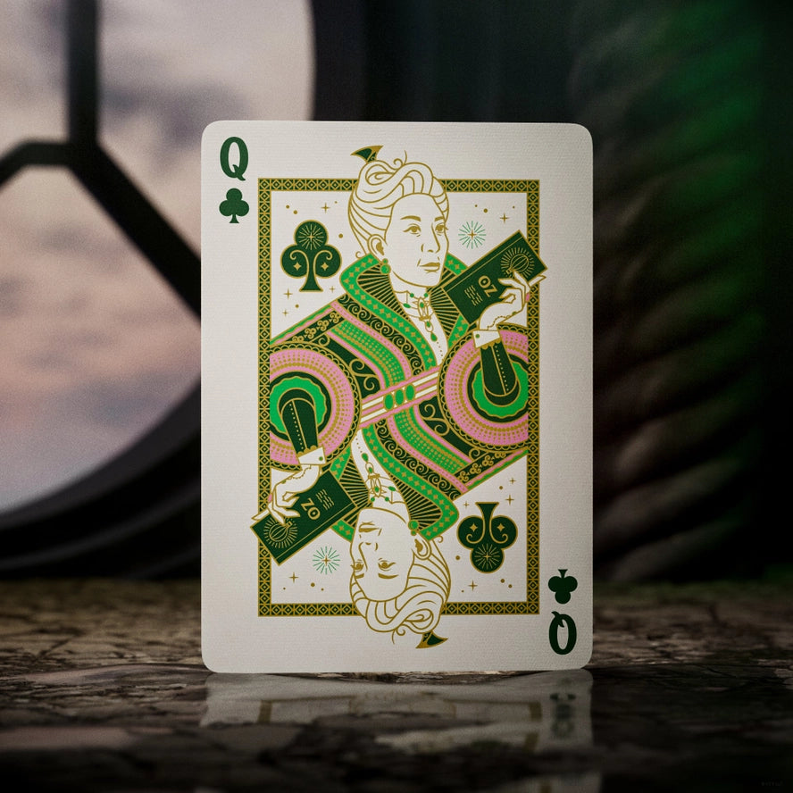 Step into the magical Land of Oz! Premium playing cards inspired by Universal Pictures' cinematic event Wicked. The Land of Oz! Defy Gravity Discover this must-have deck of cards for fans of the untold story of the witches of Oz! Featuring a regal combination of green and gold foil. Greetings From Emerald City! His Royal Ozness summons you to the Emerald City! Follow the yellow brick road with your favorite characters such as Glinda, Elphaba, Madame Morrible, The Wizard of Oz, and more! Positively Green Magic Unleashed Look closely and discover hidden Easter eggs, nodding to iconic moments from the film! From Elphaba’s green complexion to Glinda’s graceful elegance, every card is a tribute to the film's unforgettable characters and bewitching allure.